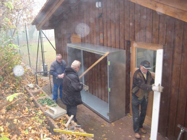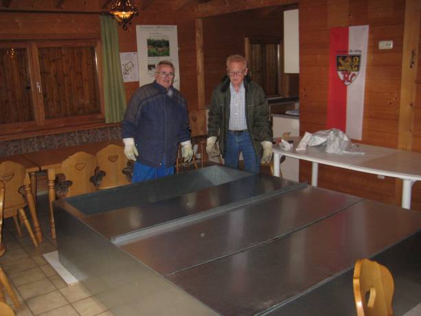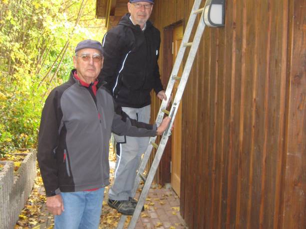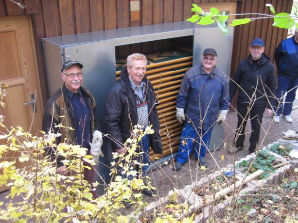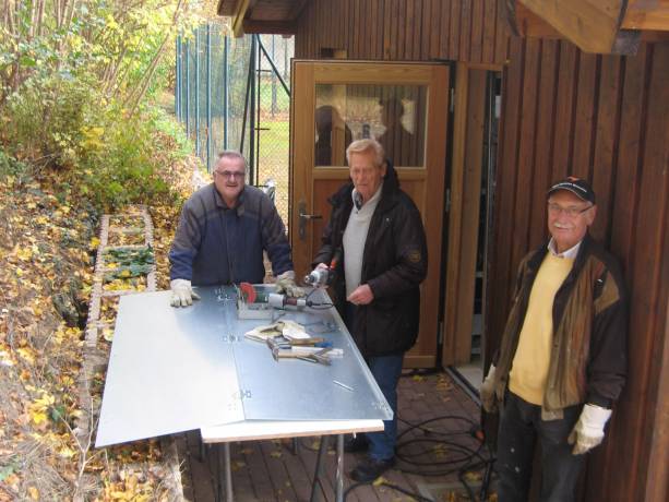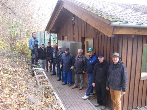 Eine seit langem geplante Abstellbox aus verzinktem Stahlblech für die Bierzeltgarnituren wurde im hinteren Außen-bereich installiert. Die 10 Tische und 20 Bänke waren bisher innen gelagert, nahmen dort in beengten Verhältnissen wertvollen Platz in Anspruch und die Handhabung beim Auf- und Abbau war umständlich und unbequem. Mit der Auf-bewahrung der Freizeitmöbel in der von außen zugänglichen Box wird nun die Außenbewirtschaftung am Bürgertreff wesentlich vereinfacht und erleichtert. In insgesamt neun dienstäglichen Einsätzen wurde die Unterstellbox zwischen dem 22. September und 17. November 2020 gebaut und installiert. Mit der von Heinz Reibel zusätzlich aufgewendeten Zeit von 15 Stunden für Planung, Bauvorbereitung und Materialbestellung, summiert sich die Eigenleistung der „Volontäre“ für den Bau der Aufbewahrungsbox auf insgesamt 102 Stunden.