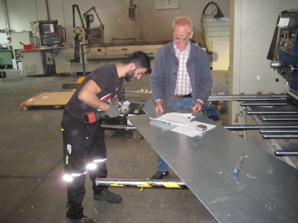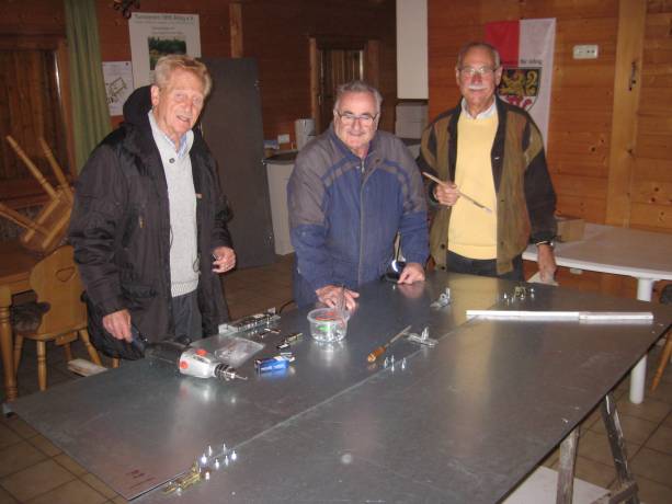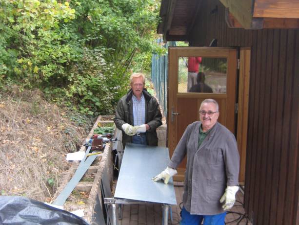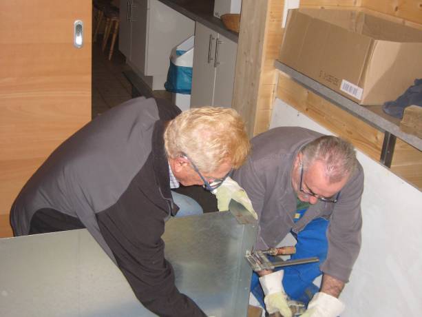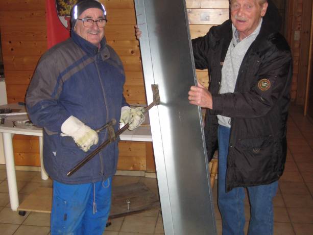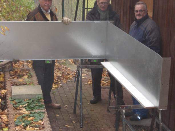 Erneut erwies es sich dabei als Glücksfall, dass die „Volontäre“ nicht nur mit guten Einfällen und Ideen glänzen, sondern auch Mitstreiter in ihren Reihen haben, die auf Grund ihres fachlichen Könnens und ihrer Berufserfahrung als solide Handwerker, diese Ideen auch umsetzen können und realisieren wollen. So wurde ein weiteres Mal eindrucksvoll demonstriert, dass die rüstigen, vorwärtsgewandten „Volontäre für Albig“ ein wahrer Segen für die Dorfgemeinschaft sind. Wertvolle Unterstützung bei der Ausführung des Vorhabens gewährte die ortsansässige Schlosserei Arno Frank, die kostenlos ihren Maschinenpark und personelle Hilfestellung für die Bearbeitung der Bleche zur Verfügung stellte. Wie bei allen bisherigen Maßnahmen der „Volontäre“ üblich, erfolgte auch hier vorab eine Absprache mit der Gemeinde, die auch die Materialkosten trägt.